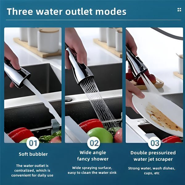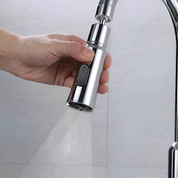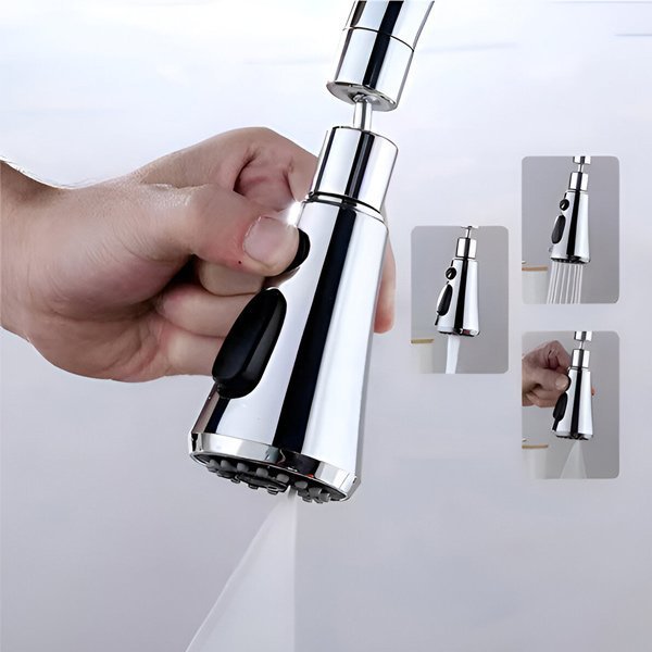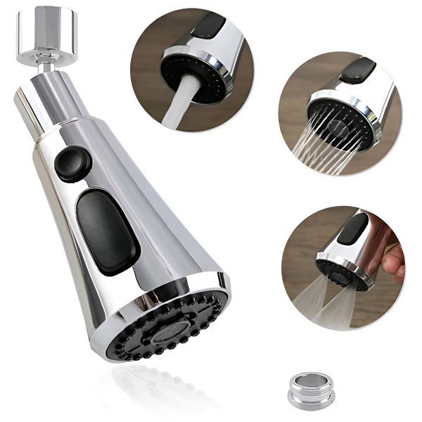 This kitchen faucet extender offers 3 different flow modes including a strong jet, a distributed rotary flow and a water saving mode.